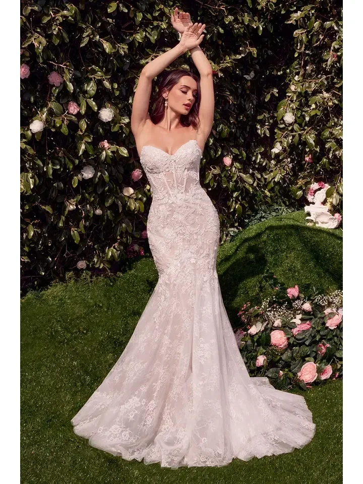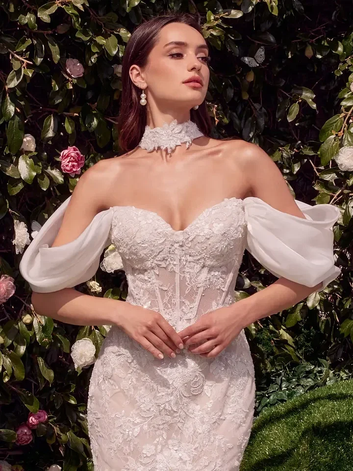 This strapless mermaid gown features a sweetheart neckline and a structured bodice for enhanced support, beautifully crafted from layered lace. The removable off-the-shoulder organza shawl adds a romantic touch, perfect for a sophisticated bridal look. Ideal as a wedding dress, this gown exudes timeless elegance and grace. Key Features: Silhouette: Strapless, mermaid Design: Sweetheart neckline & removable organza off-the-shoulder shawl Fabric & Material: Layered lace & Organza Fit Detail: Structured bodice for enhanced support Occasions: Ideal as a wedding dress or bridal gown Sizing: Available in sizes 6-14