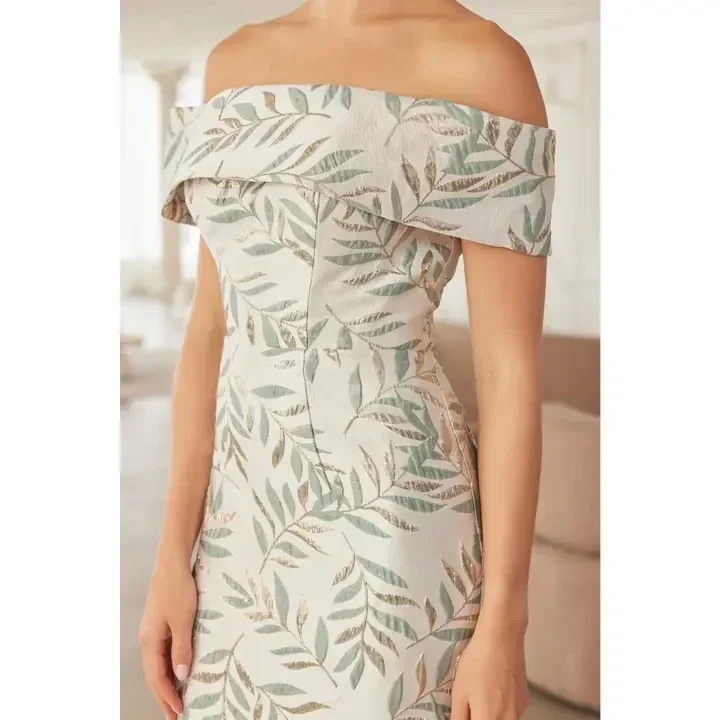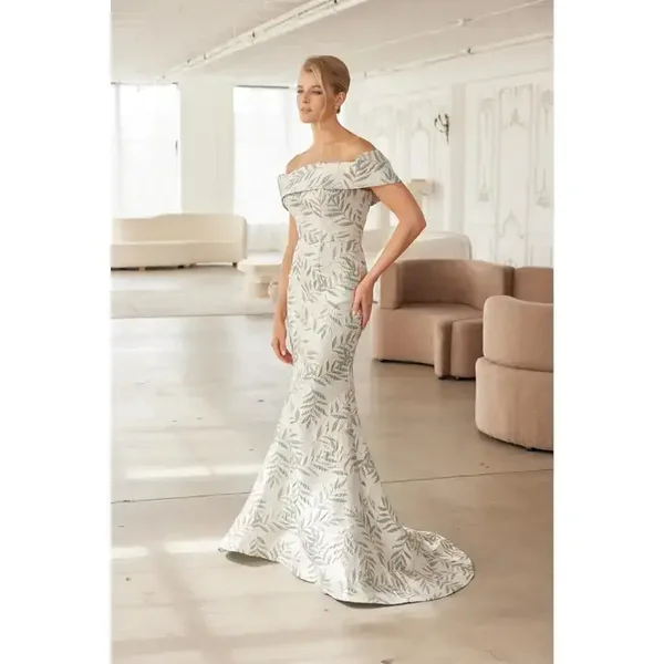 This exquisite mother of the bride dress is crafted from a luxurious jacquard material, elevating the overall look with its rich, textural quality. The figure-flattering trumpet silhouette creates a dramatic, regal impression, while the off-the-shoulder, fold-over top adds an alluring, modern touch. The fold-over neckline beautifully frames the face, while the long, flowing train cascades elegantly behind. This stunning combination of a structured bodice and sweeping skirt results in a truly remarkable, high-fashion aesthetic. Poised and elegant, this mother of the bride dress is a true showstopper. The jacquard fabric, trumpet silhouette, and glamorous off-the-shoulder design make this gown a remarkable choice for the special occasion. No stretch! Jaquard material- no stretch!